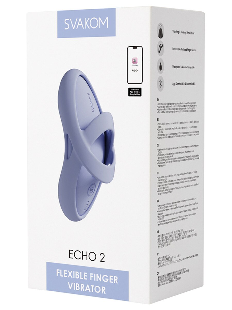 Echo 2 becomes a second kin once you slip this curves, flexible vibrator onto your finger, or use it as a panty vibe or a lay-on vibe. Arouse external pleasure zones with exiting vibrations, warmth to 38°C, and pleasure ridges on the removable, stretchy finger sleeve,, all in a travel-friendly, body-safe design. Use Echo 2 with the SVAKOM App to customise settings or play long-distance.